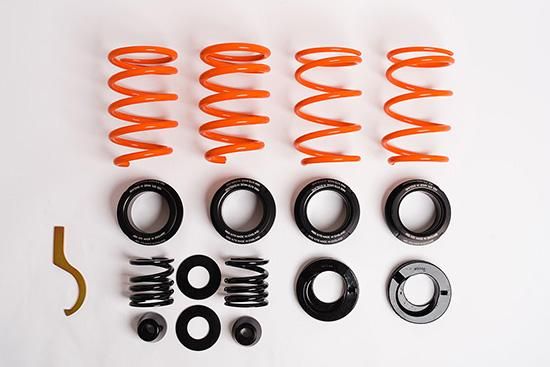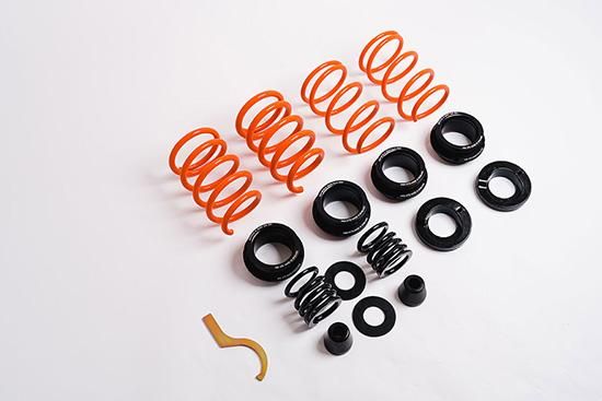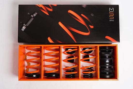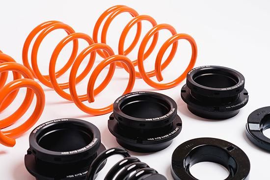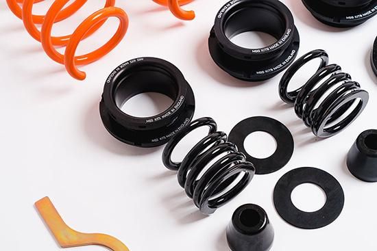 - MSSの最大の特徴であるデュアルスタック、トリプルレートスプリングはシングルのフロントスプリングとデュアルのリアスプリングの組み合わせで、純正のサスペンションの電子制御ダンパーと非電子制御ダンパーの機能を維持しながら、車高調整出来る機能が追加されます。