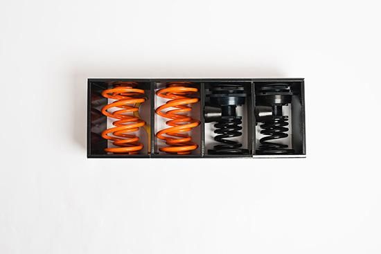 - MSSの最大の特徴であるデュアルスタック、トリプルレートスプリングはシングルのフロントスプリングとデュアルのリアスプリングの組み合わせで、純正のサスペンションの電子制御ダンパーと非電子制御ダンパーの機能を維持しながら、車高調整出来る機能が追加されます。