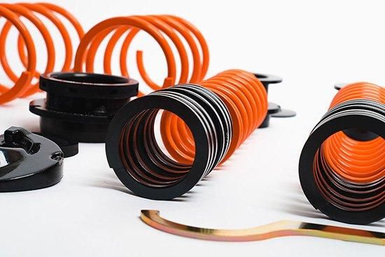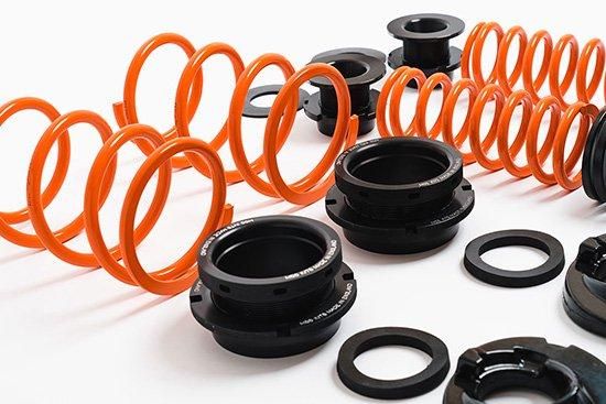 - MSSの最大の特徴であるデュアルスタック、トリプルレートスプリングはシングルのフロントスプリングとデュアルのリアスプリングの組み合わせで、純正のサスペンションの電子制御ダンパーと非電子制御ダンパーの機能を維持しながら、車高調整出来る機能が追加されます。